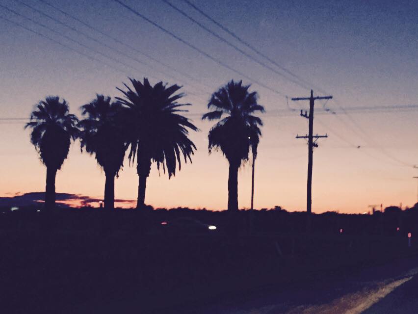 There was something about the way the palm trees stood in silhouette against the waning sunset that reminded her of those Californian souvenir tea towels from the 70’s she saw on TV sometimes.