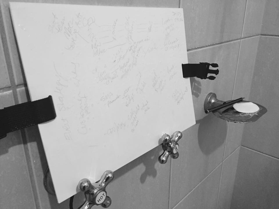 I recognised about 12 months ago that once I stepped into the shower it was like I had taken a truth serum and the answers would just appear or that the water created an immense sense of clarity so that all my thoughts crystallised and I could distill them quite logically once I was in there. But, the minute I got out of the shower and towelled off, the thoughts vaporised! So I started to to try a few things. I tried whiteboard markers but they wouldn’t take to the glass or tiles once they were wet and if you managed to get some writing on a dry surface, the condensation would cause the marker to run. I googled for waterproof papers and other options until I stumbled across the diving tablet.
